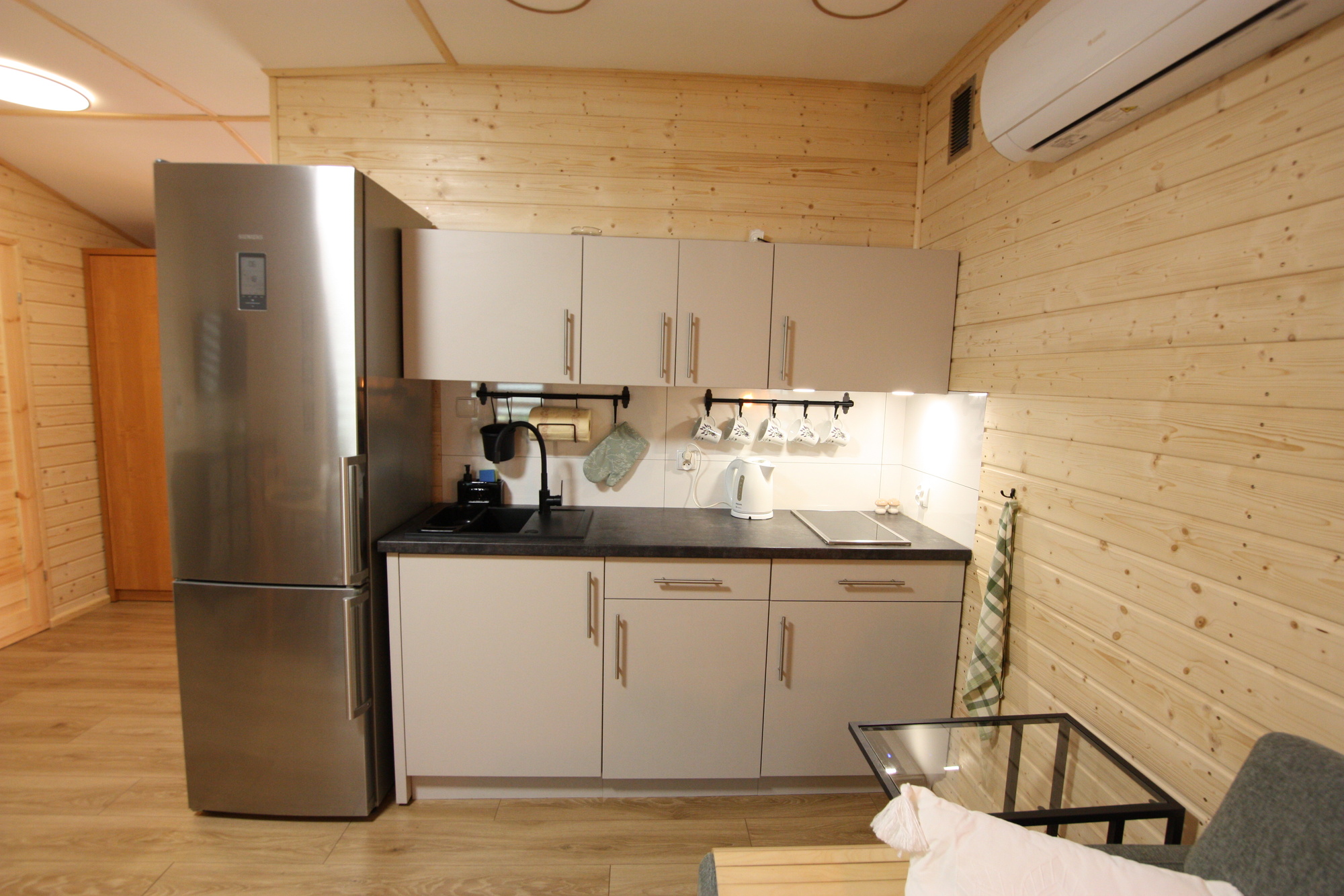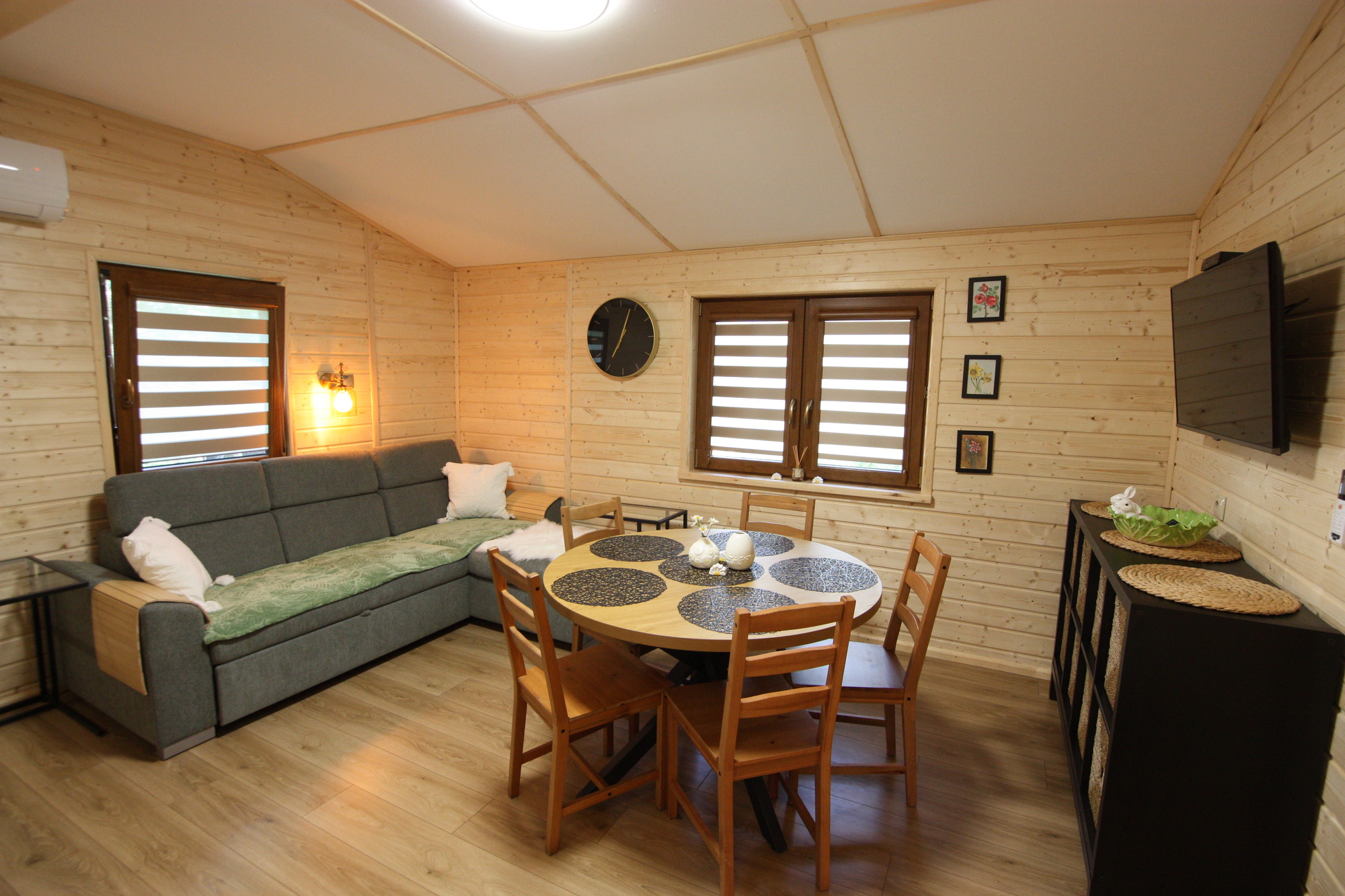Trzy pokoje (salon:narożnik rozkładany,I pokój: łóżko dwu osobowe, II pokój: dwa łózka jednoosobowe), kuchnia (zlewozmywak, kuchenka 2 palnikowa, lodówka, czajnik bezprzewodowy, sztućce, naczynia, garnki, patelnia), łazienka (wc, prysznic, umywalka), klimatyzacja, meble ogrodowe, pościel, grill